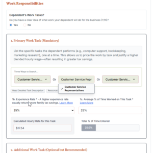 We analyze each clients situation to generate a wage strategy that supports meaningful tax savings while staying grounded in real, defensible work. Rather than defaulting to conservative or arbitrary numbers, the process evaluates tasks, scope, and structure so wages align with what the dependents actually does for the business. The system includes a built-in, dependent-specific time-tracking template designed to standardize documentation of hours and responsibilities, while also helping dependents articulate their work in resume-ready terms. The result is a clearly defined strategy that legitimately shifts income, reduces overall family tax burden, and holds up under scrutiny.